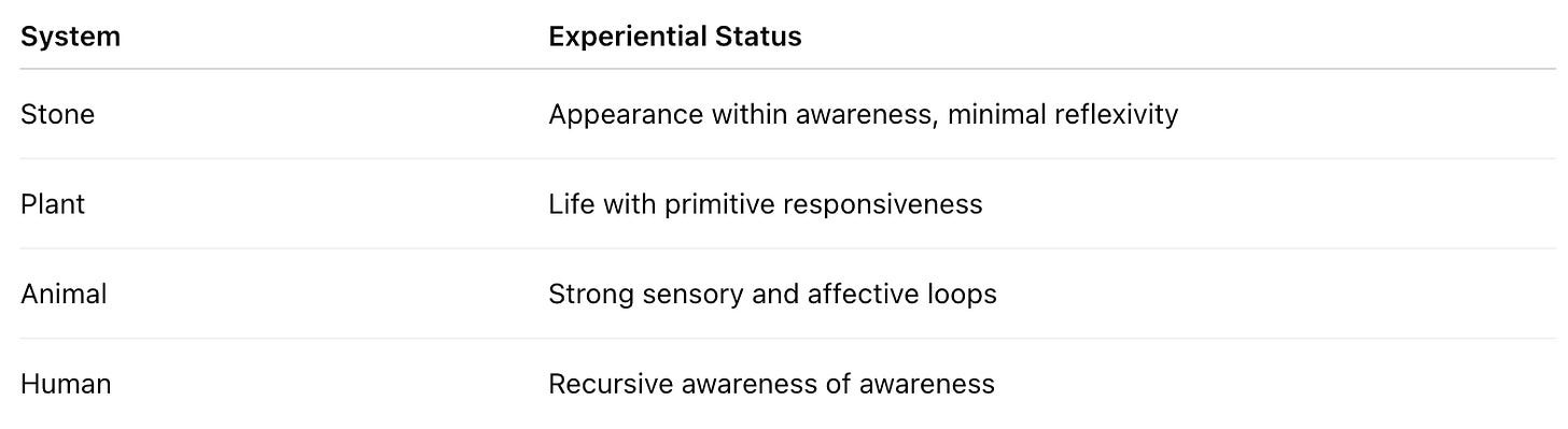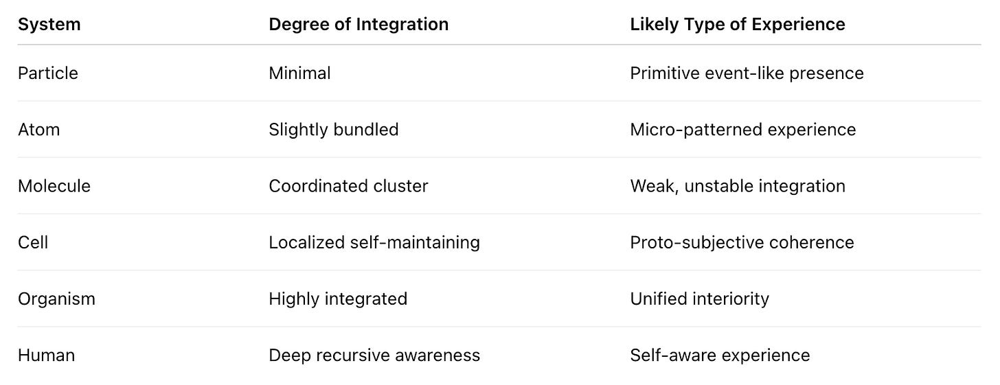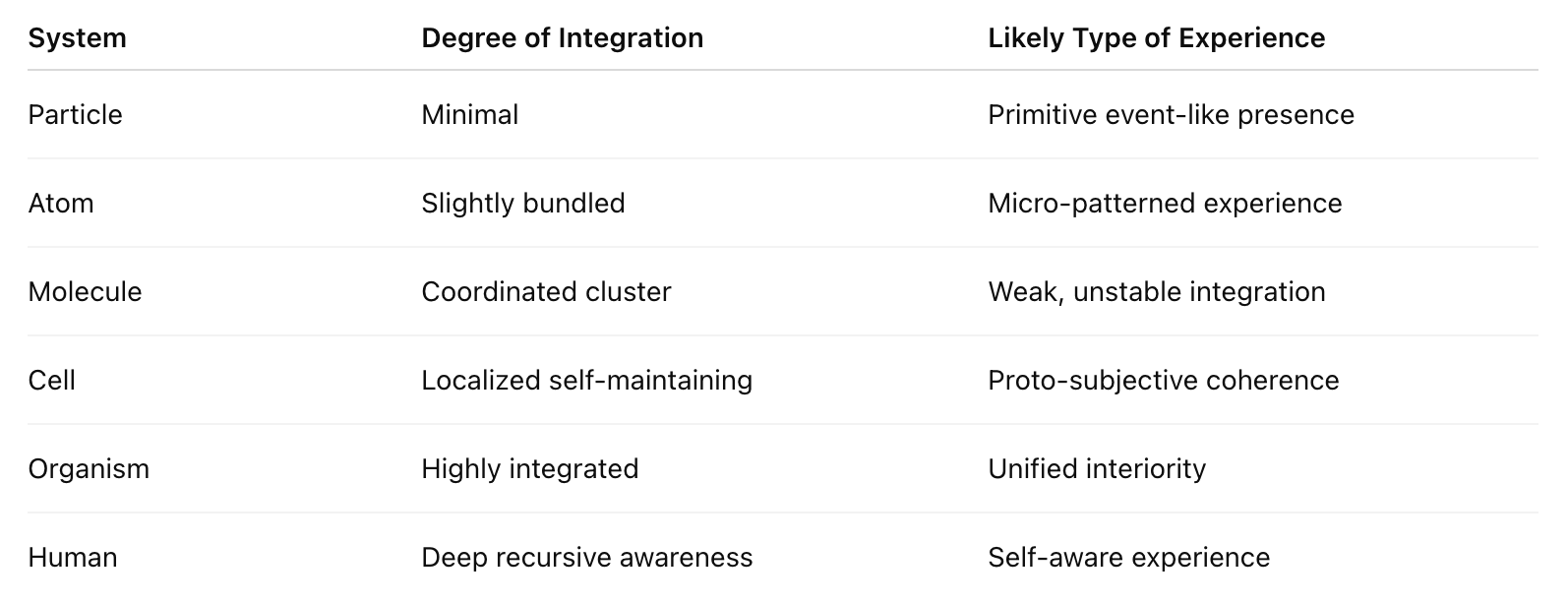 Experience may not be binary. Instead, it appears graded by integration and coherence.