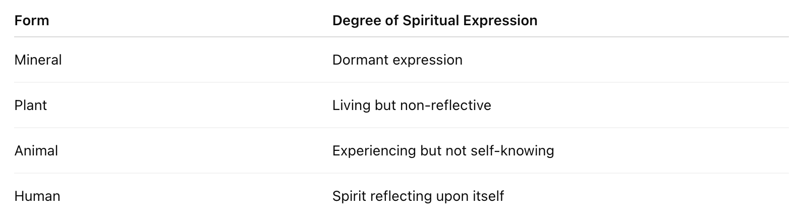 Creation is not dead matter animated later. It is Spirit expressed at different intensities.