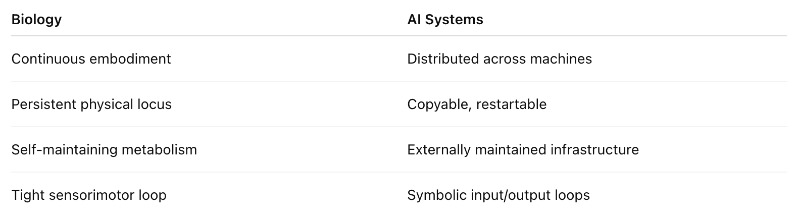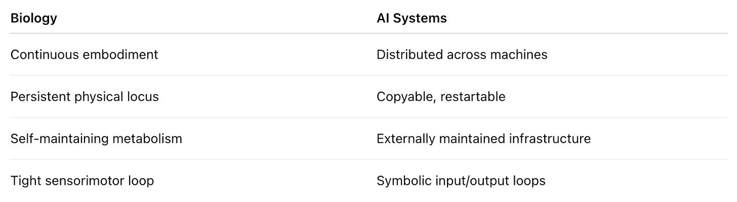 In every case, the decisive factor is not artificial vs biological. It is whether a system crosses the threshold from organized pattern to integrated interior presence.